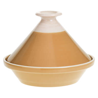 Tajine de loza en color mostaza y un detalle beige en la parte superior. Ideal para realizar platos de inspiración árabe. Medidas: 28 cm altura y 23 cm diámetro